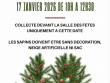 Devant la salle des fêtes, le 17 janvier uniquement de 10h à 12h30. Les sapins doivent etre sans décoration, sans neige...